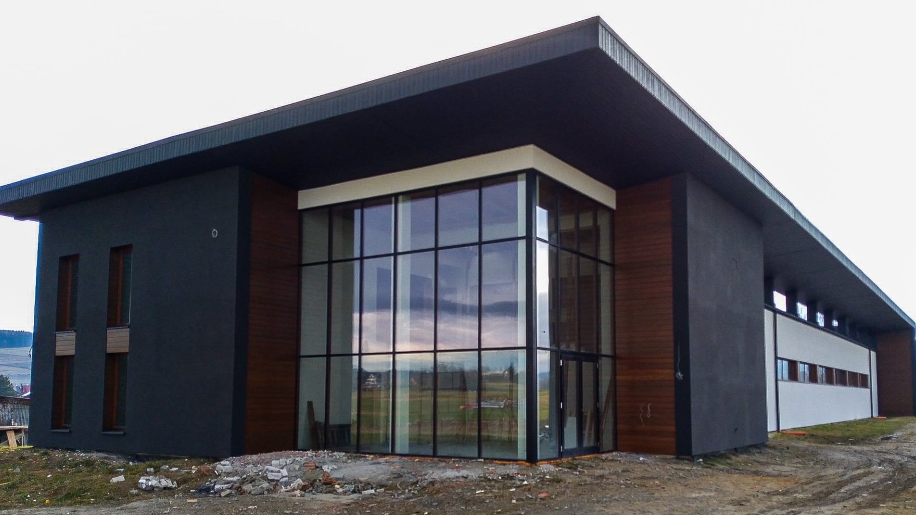 Zdjęcie nowopowstającej hali produkcyjnej i części biurowo-usługowej