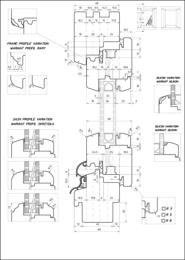 Wersje stylistyczne listewki kołoszybowej oraz krawędzi ramy i skrzydła: